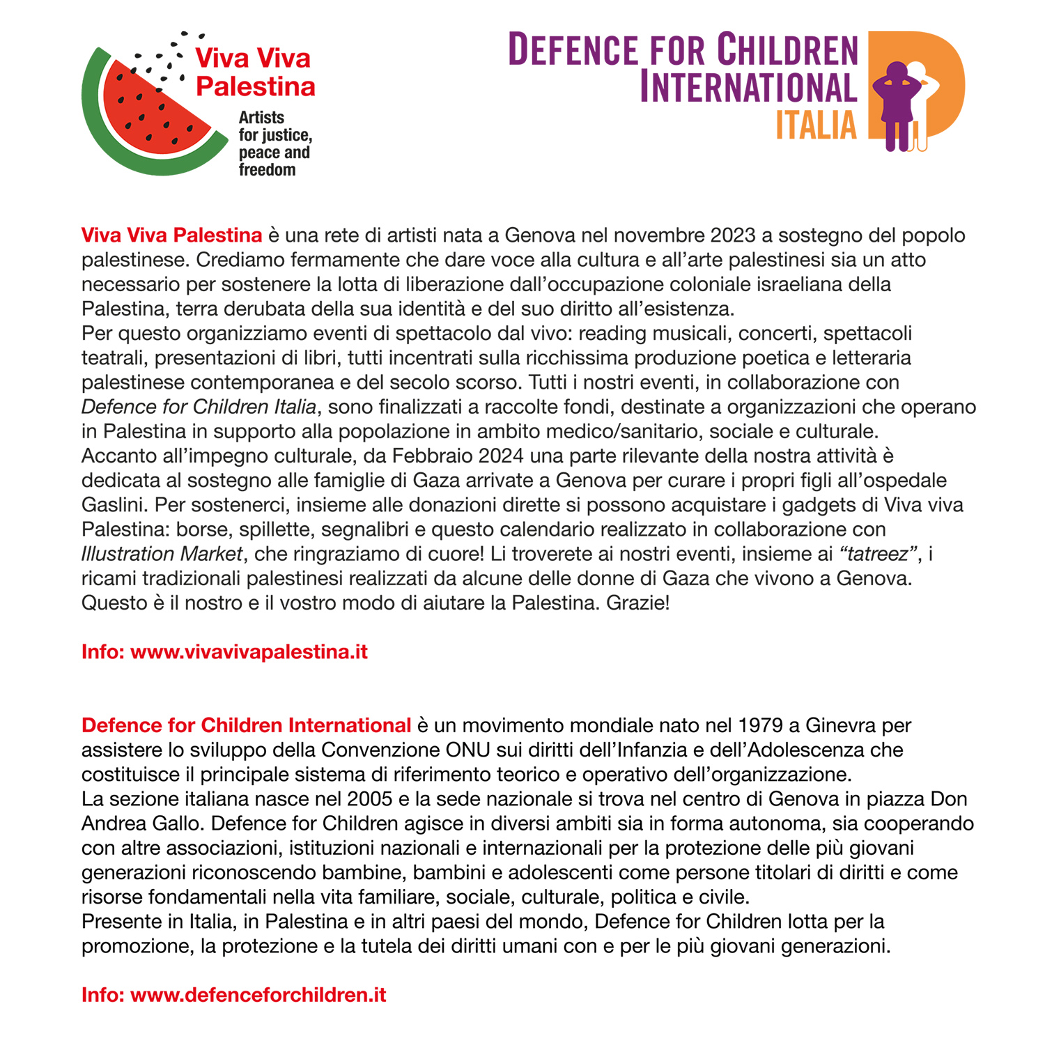 Tutto l’incasso della vendita del Calendario andrà a sostegno delle famiglie di Gaza residenti a Genova. Soteneteci!